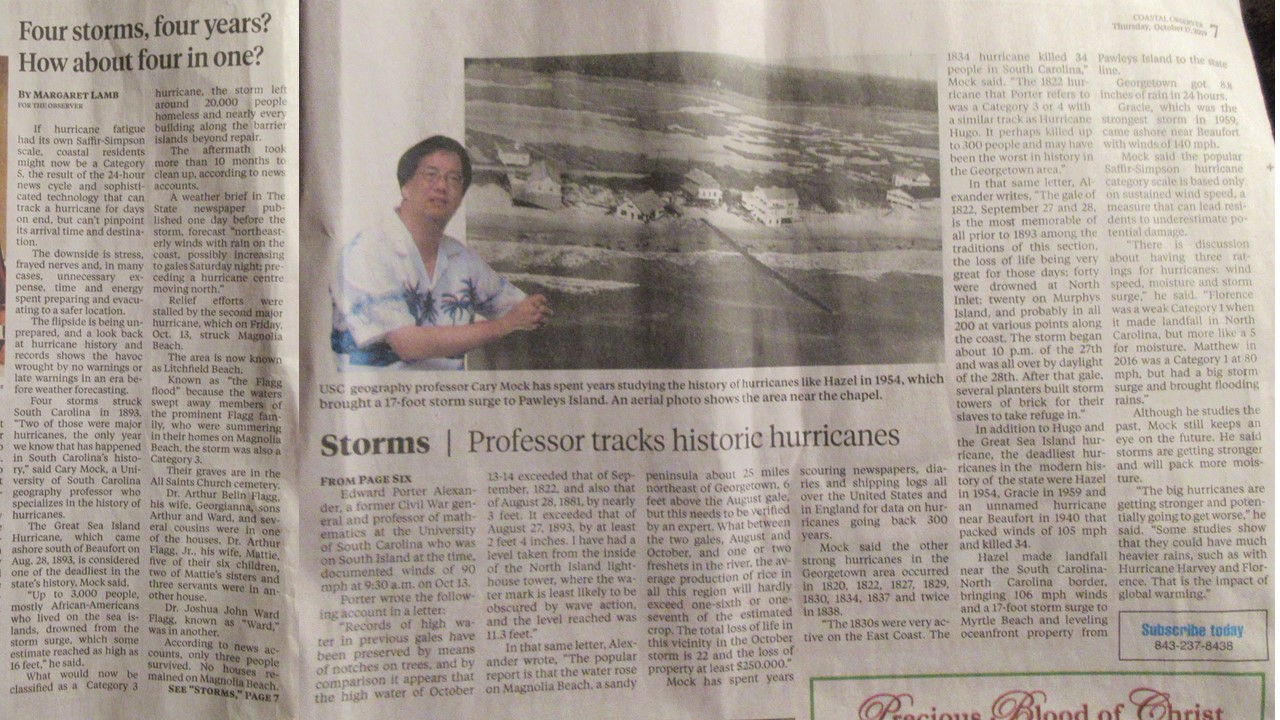 Detailed article on Cary Mock and Mike Chenoweth on Historical Hurricane Research from the Post and Courier