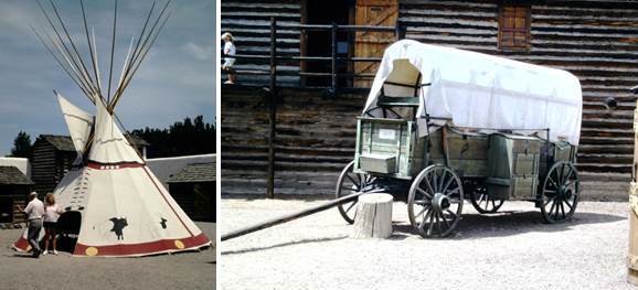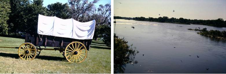 Wagon at Fort Kearney, NE (left), and the Platte River near Kearney, NE (right)