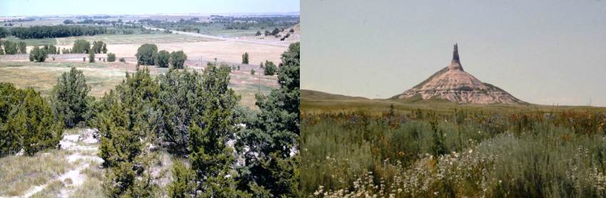 View of western Nebraska from Ash Hollow (left), and Chimney Rock, NE (right)