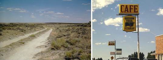 Old Oregon Trail Rd in southwestern WT (left), and a sign in Farson, WY (right)
